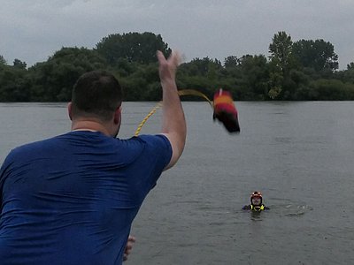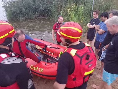 An drei Stationen konnten die Kameradinnen und Kameraden der Feuerwehr unser IRB (Inflatable Rescue Boat), verschiedene Rettungswesten sowie weitere Rettungsmittel wie Wurfsack und Gurtretter kennenlernen und direkt praktisch ausprobieren.